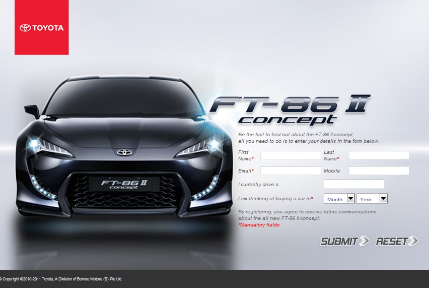 According to AsiaOne Motoring, Toyota's latest sports coupe, the 86, will likely arrive in Singapore in the middle of 2012, as confirmed by Borneo Motors Singapore recently. In fact, the authorised distributor for Toyota has already started collecting indications of interest on the sports coupe concept on its website a few weeks ago (refer to the screenshot above). The 86 is recently launched at the 2011 Tokyo Motorshow.