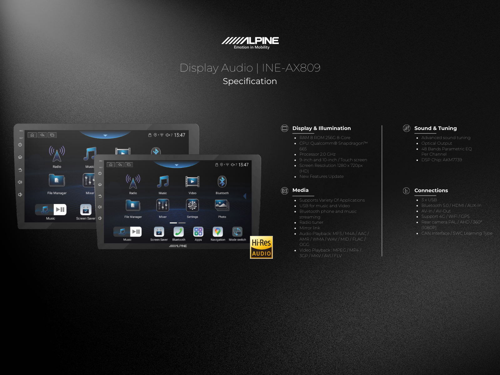 The new Alpine INE-AX809, upgrade to modern and outstanding features to enhance your driving experience. With a powerful CPU and 8GB RAM/256GB storage, the INEAX809 display provides quick and convenient access to applications and features, supporting various multimedia formats and Hi-Res Audio playback for superior sound quality. The design seamlessly integrates with your car for a perfect fit.