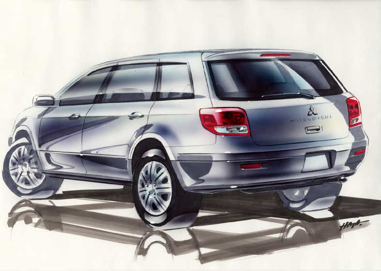 Read this today and thought this would be a good revision on the Airtrek's background since it's intro sometime back early in the year:- As the modern automotive landscape evolves, traditional and distinct vehicle categories like the sport utility vehicle (SUV) and estate are becoming increasingly blurred. Not content with an elaborate re-packaging exercise of one of its existing estates or SUVs, Mitsubishi has launched the all-new Airtrek. Billed by Mitsubishi as a "crossover recreational vehicle", the Airtrek is a clever blend of the practicality of an estate with the off-road muscle of an SUV. The brawny yet elegant exterior lines exude just enough machismo such that it wouldn't look out of place frolicking off-road or cruising down town. On the inside, circular dials and vents lend a retro and sporty air to the cabin while the panel-mounted shift lever liberates space upfront. The seats have been strategically placed 600 mm off the ground for easy ingress and egress while extensive sound insulation and foam-filled pillars ensure that noise intrusion is kept to a minimum. The luggage compartment holds a useful 402 litres with 5 passengers in place and 1049 litres with the rear seats folded forward. Powering the 24 series is Mitsubishi's 4G64 2.4 litre engine with fuel-sipping GDI (Gasoline Direct Injection) technology while the 20 series draws life from the proven 4G63 2.0 litre ECI-Multi unit. Although the GDI unit has an edge in both the power and fuel economy epartments, both engines deliver enough grunt for off-road jaunts and have the flexibility necessary for relaxed urban and highway cruising. Power reaches the wheels via Mitsubishi's intelligent and adaptive 4-speed INVECS-II automatic transmission, which comes with a sequential-type sport shift mode. On the safety front, Mitsubishi's "RISE" body dulls impact forces while dual airbags further cushion the front passenger and driver. Anti-lock brakes and electronic brake force distribution are standard as well. With superior ride comfort in mind, the wheelbase has been stretched to a class-leading 2625 mm while ample ground clearance (195 mm) keeps the bodywork clear of uneven terrain. Its rigid monocoque construction, which not only dampens vibrations and noise, and relatively low vehicle height (1550 mm) contribute greatly to handling stability. Automotive design usually involves trade-offs. Ride comfort often comes at the expense of handling stability while a purposeful off-roader usually sacrifices some on-road ability. The Airtrek's unique design makes it more practical than an SUV for daily use and yet more flexible than a traditional estate in terms of the types of terrain it can handle. Its balance of form and function, tempered with clever engineering enable it to transcend the barriers that have, until now, kept the concrete and evergreen jungles apart. Instead of photo shoots, here are some 'artistic' sketches.........