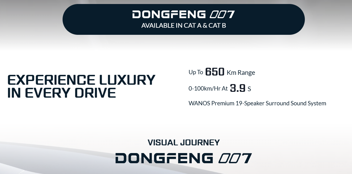 https://dongfeng.sg/dongfeng-007/ (with pricing info) https://www.sgcarmart.com/new-cars/info/22028/dongfeng-007-electric